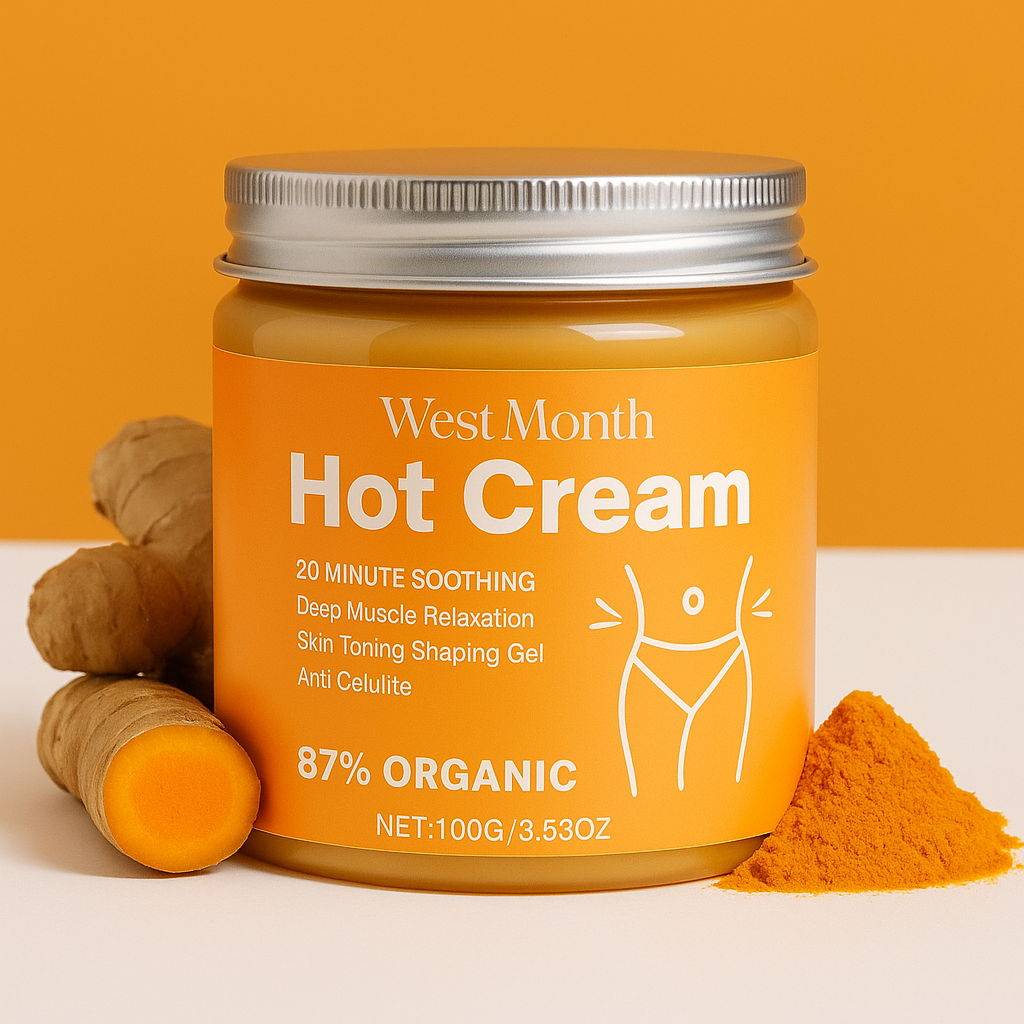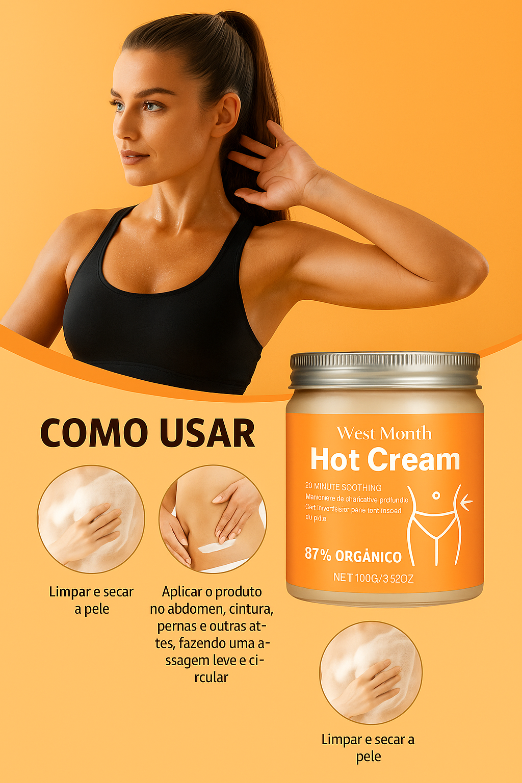 O West Month Hot Cream é um gel/creme modelador com sensação térmica (aquecimento suave) que ajuda a relaxar a musculatura, tonificar a pele e melhorar o aspeto da celulite com uso contínuo. A fórmula combina extratos naturais como gengibre, toranja (citrus) e hortelã-pimenta, além de glicerina e hialuronato de sódio para hidratação.