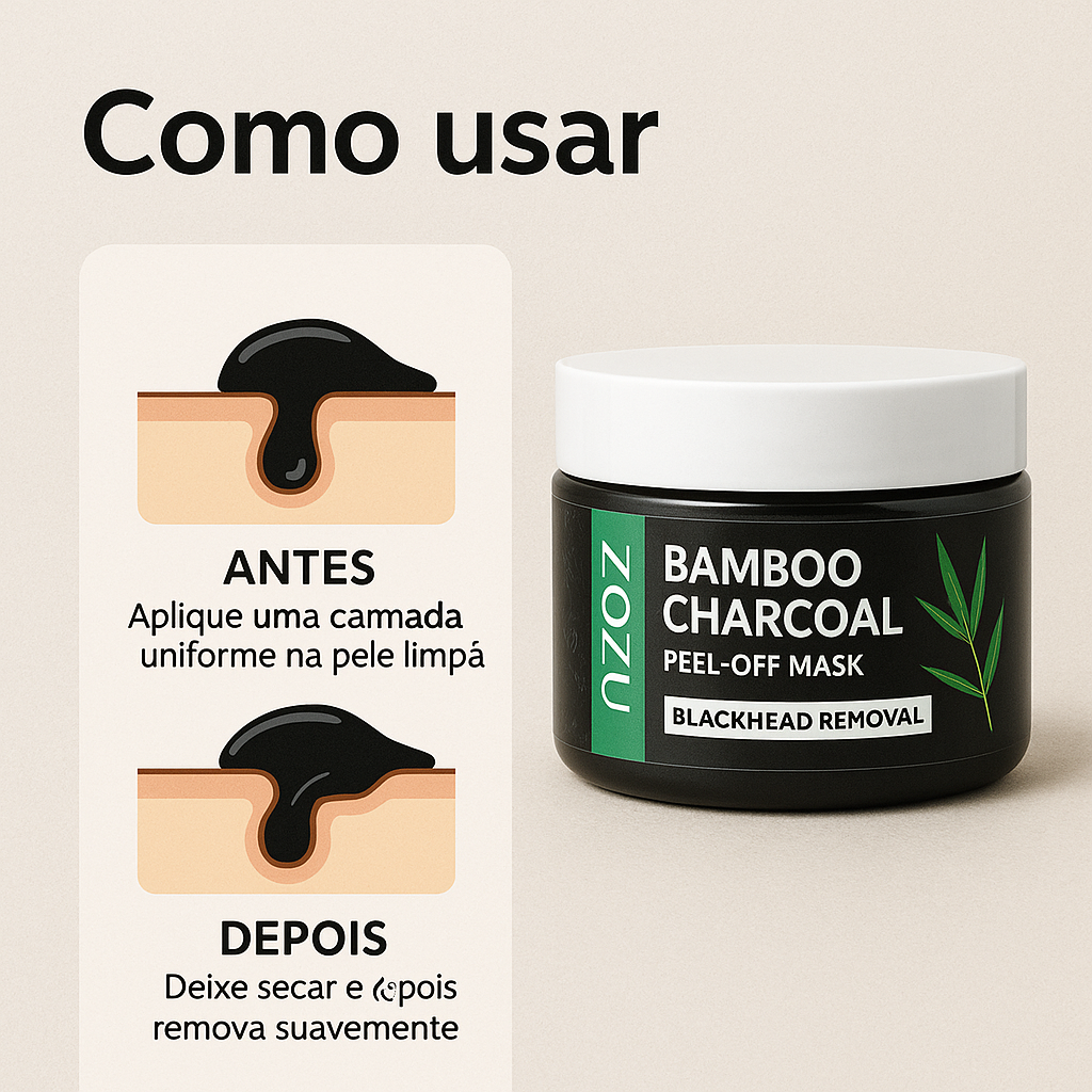 Máscara peel-off com carvão de bambu para remover pontos negros, purificar poros e suavizar a pele. Ideal para zonas T. Uso 1–2x/semana.